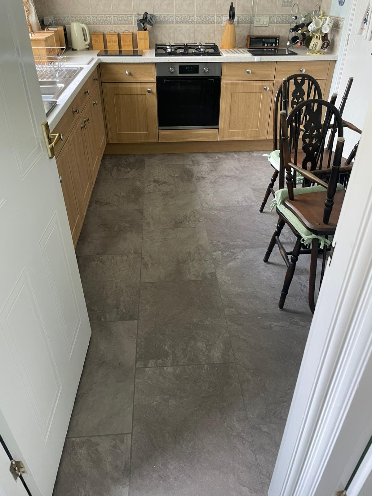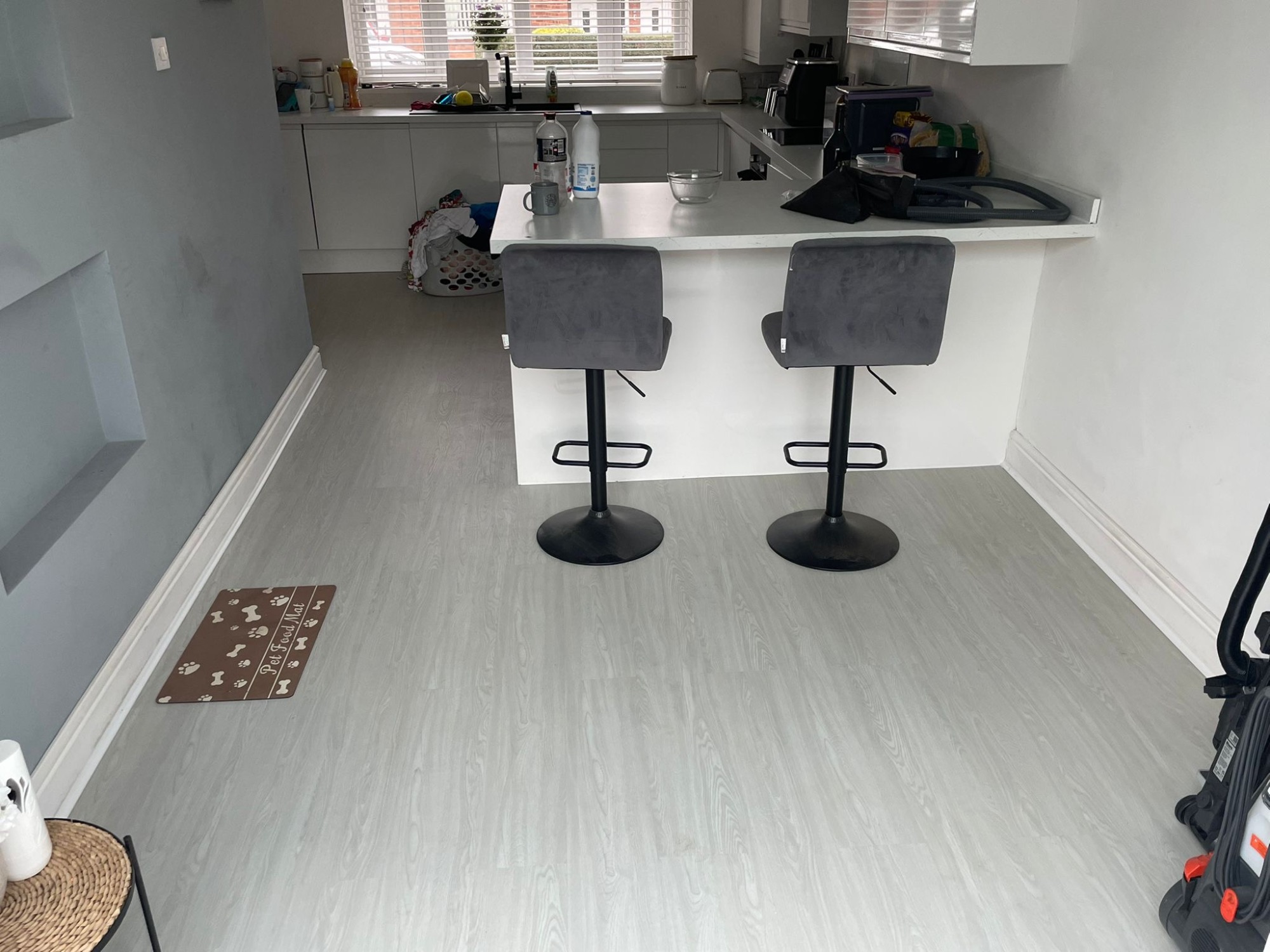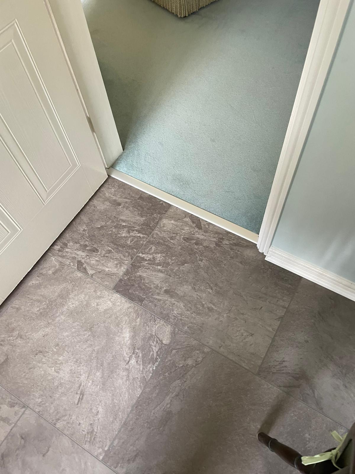 Howdens Oake & Gray White Marble vinyl flooring Howdens Karndean Coastal Fog vinyl flooring Finished with White Scotia & Silver Doorbars