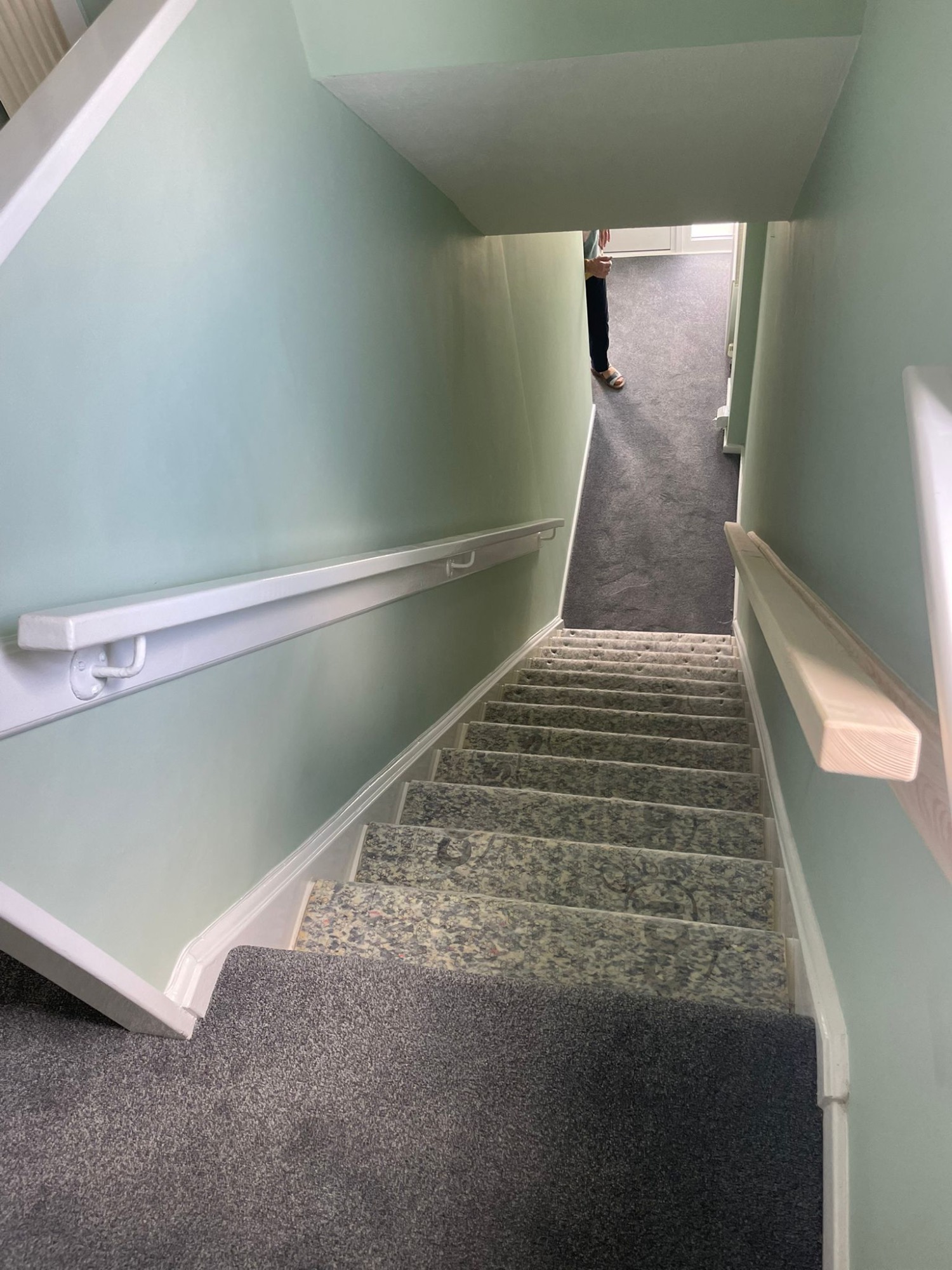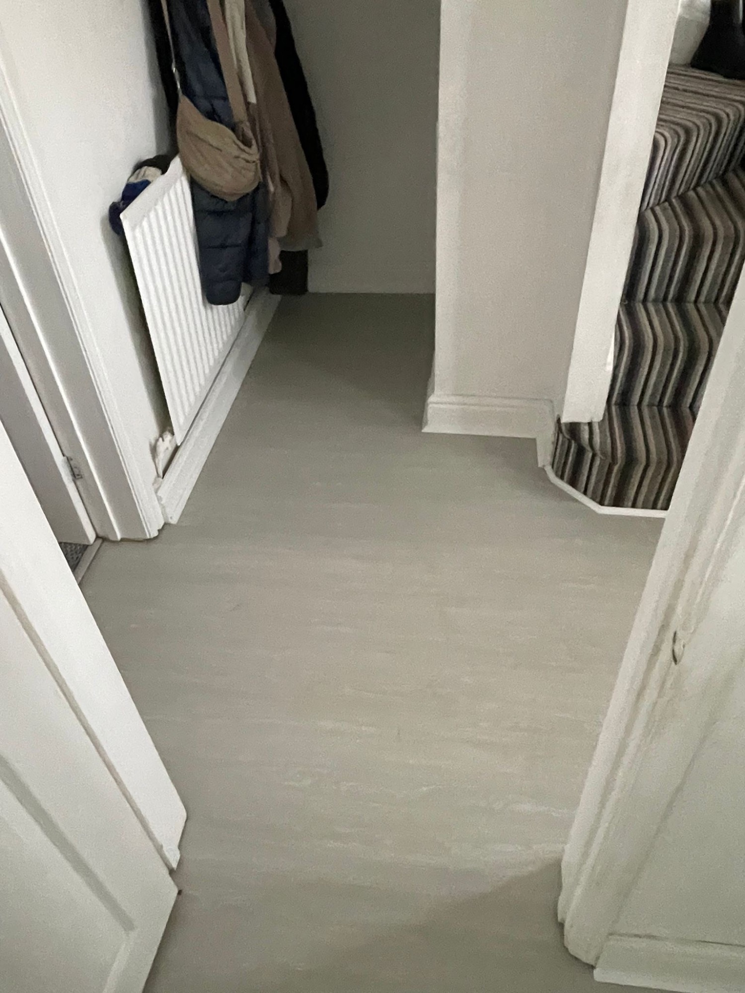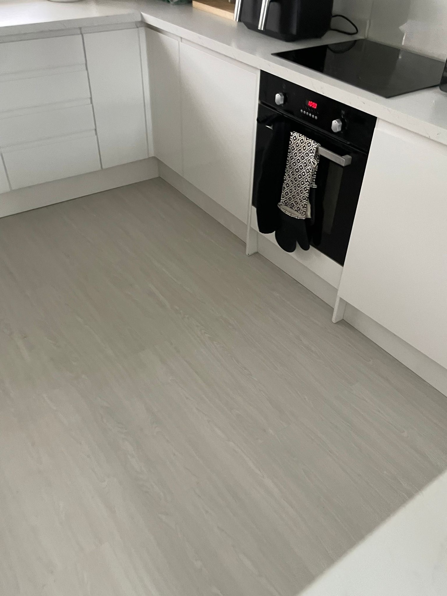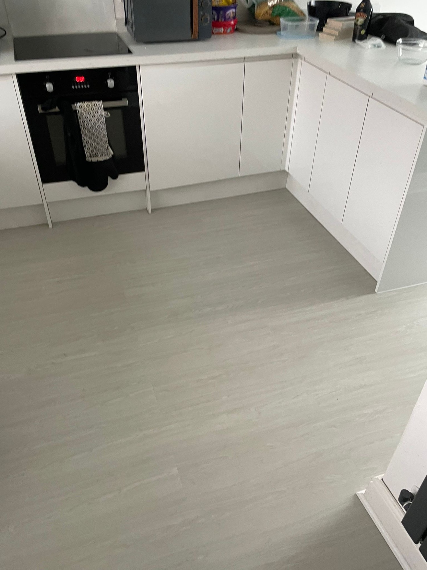 Howdens Oake & Gray White Marble vinyl flooring Howdens Karndean Coastal Fog vinyl flooring Finished with White Scotia & Silver Doorbars