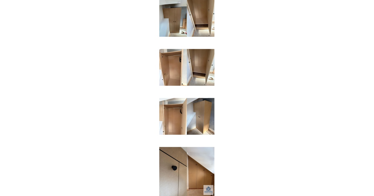 Custom MDF wardrobe with hanging rail & shelves Custom MDF wardrobe door replacements Custom MDF filling panels Black handles