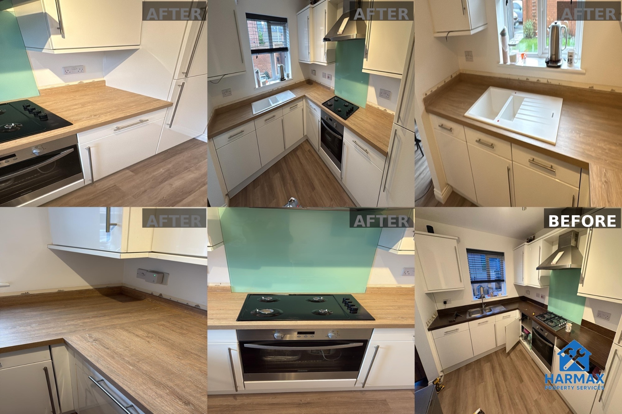 Old worktops, sink & hob removed Howdens Linear Oak Effect square edge worktops Howdens Linear Oak Effect up-stands New sink & hob